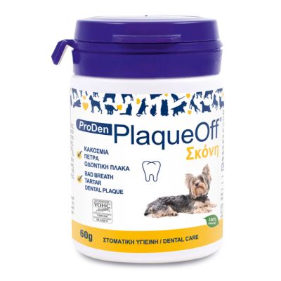 Η κακοσμία είναι μία ένδειξη ότι αντιμετωπίζει προβλήματα στοματικής υγιεινής. Η σκόνη αυτή είναι ένας εύκολος τρόπος για να βελτιώσετε τη στοματική υγιεινή του κατοικιδίου σας. Ιδανικό για την εξάλειψη της κακοσμίας καθώς και της υπάρχουσας πλάκας και της πέτρας. Είναι ένα απόλυτα φυσικό προϊόν που περιέχει ένα πατενταρισμένο είδος φυκιού, με αποδεδειγμένα οφέλη στη στοματική υγιεινή. Μπορεί να χρησιμοποιηθεί και προληπτικά. Το 85% των σκύλων και το 75% των γατών άνω των τριών ετών εμφανίζουν ουλίτιδα, η οποία προκαλεί πόνο στο στόμα και μπορεί να επιφέρει απώλεια δοντιών. Αποτελεί μια θεραπεία απαραίτητη για τη στοματική υγιεινή του σκύλου σας. Αν το κατοικίδιο σας υποφέρει από κακοσμία, η κύρια αιτία στο 80% των περιπτώσεων είναι η οδοντική πλάκα και πέτρα. Σε αντίθεση με άλλες μεθόδους ελέγχου της πλάκας, το Plaque Off δρα μέσω του αγγειακού συστήματος. Αποτρέπει την επικόλληση της πλάκας στα δόντια και μαλακώνει τα υπάρχοντα υπολείμματα πέτρας. Λόγω της υψηλής περιεκτικότητας σε ιώδιο φυκιού, το προϊόν μπορεί να μην είναι κατάλληλο σε ζώα που ακολουθούν θεραπεία υποθυρεοειδισμού. Πριν την χρήση του συμβουλευτείτε τον κτηνίατρο.